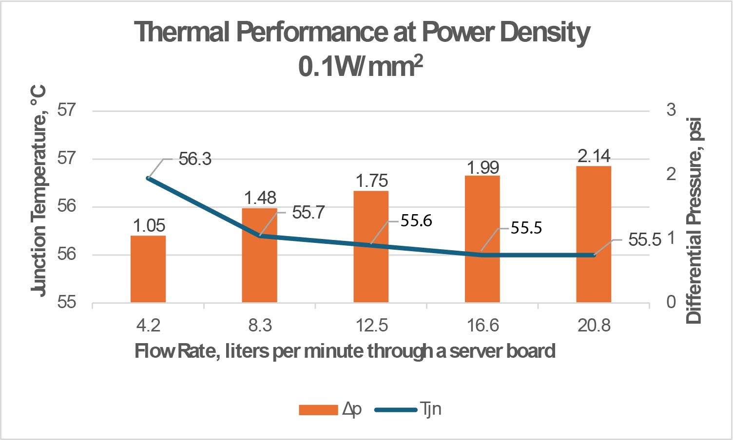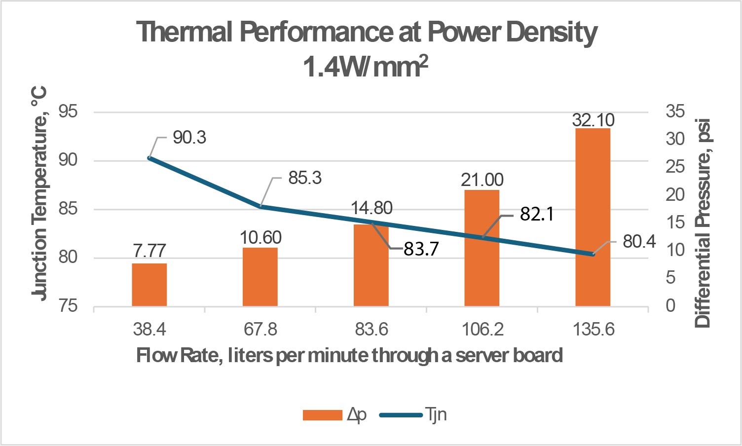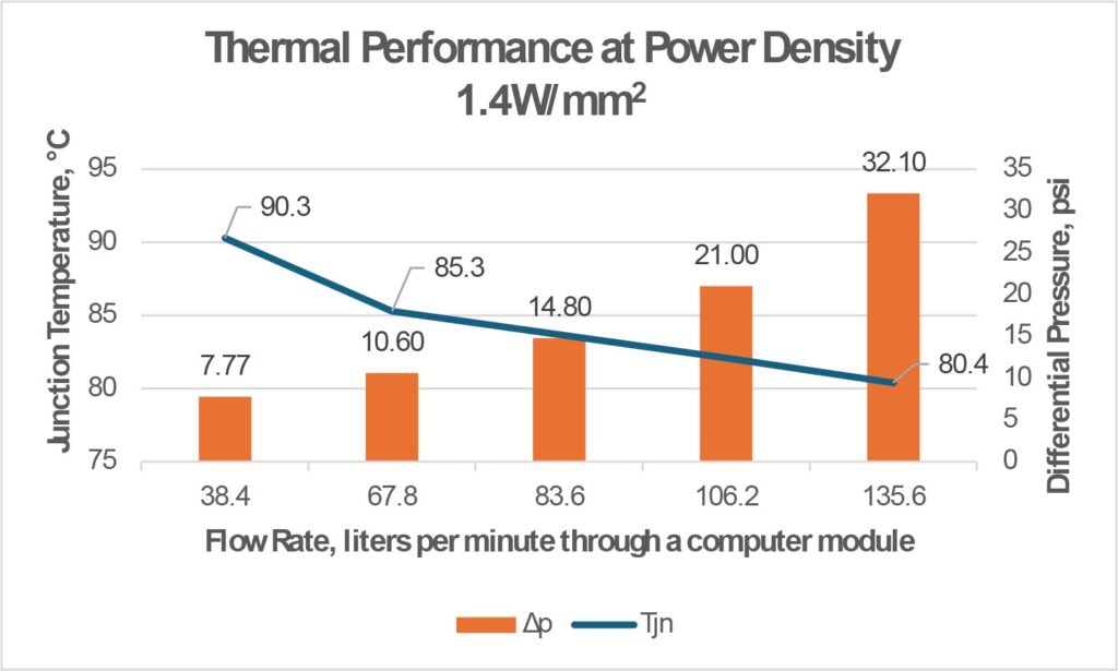 As an example of test results in our lab, the graph shows for a microelectronic module that at a power dissipation of 1.4 watts per square millimeter the thermal performance maintains a junction temperature of 85.3°C at a coolant flow rate of 67.8 liters per minute and a differential pressure of 10.6 psi.